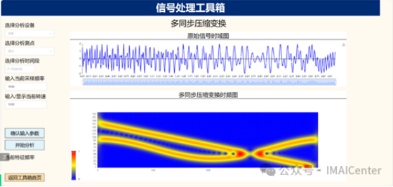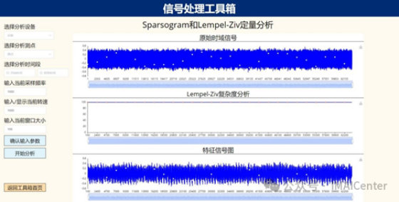 从信号处理算法工具箱主控界面可以看到,该工具箱实现的功能主要为各类信号处理算法的演示与分析,图形化的操作界面,操作人员可以直接通过左侧下拉菜单选择各类算法对信号进行处理分析,即使是技术水平不高的工人也可应用此软件调用各类信号处理算法。