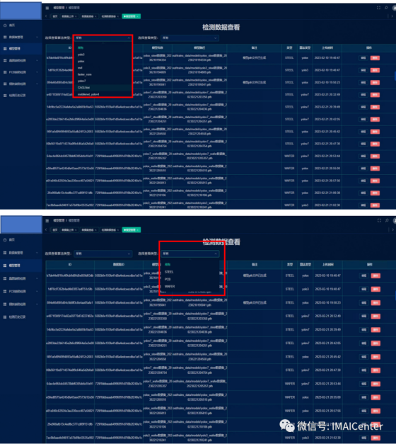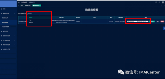 此界面为模型管理界面,模型来源于训练过程中,可通过模型名称与数据集名称进行下拉框的搜索确定,这些模型可以用于测试,若效果好即保存,效果不好可在右边编辑部分进行删除。