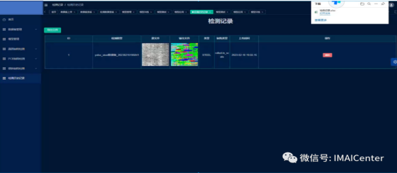 此界面为检测历史查看界面,保存每个模型对图片检测的结果,可查看对应的检测模型名称、原始图片文件、检测结果文件、检测对象类型、缺陷类型以及上传时间,在编辑功能中可将记录进行删除,点击“文件导出”,可以将检测记录进行Excel的导出。