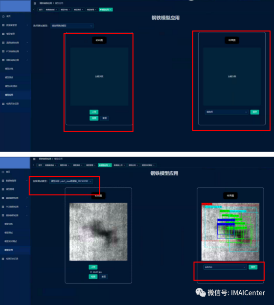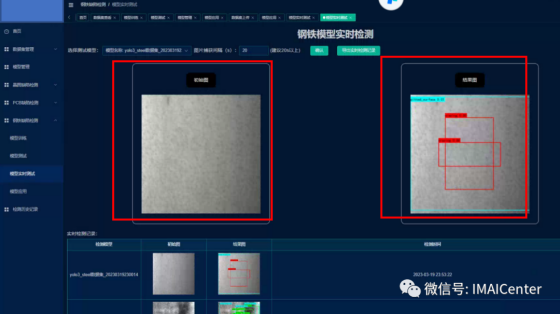 (3)此界面为模型应用检测部分,左边为原图,右边为打上锚框的检测结果图首先选择之前测试过的效果较好的模型,接着点击图像“上传”按钮,完成后点击“检测”按钮,右边即出现检测结果,结果产生时,下拉框中选择缺陷类型进行保存,可在后续检测历史查询中进行查找。