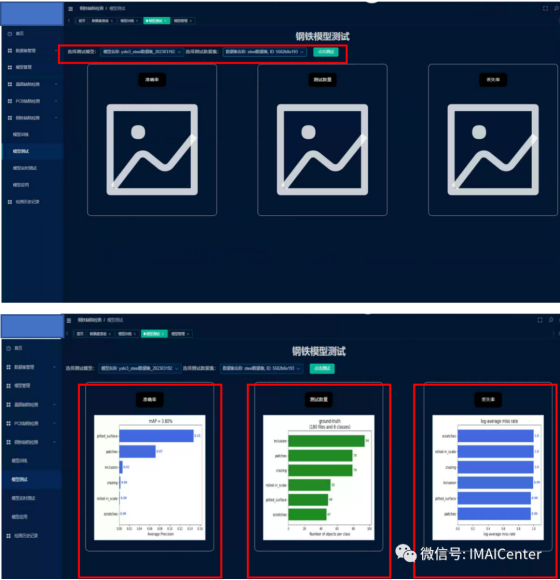(2)此界面为钢铁模型测试部分,前期训练好的模型可以在下拉框中进行选择,点击“点击测试按钮”,即可出现三个模型测试的指标图示,分别为各个缺陷类别的准确率,测试数量以及平均丢失率。如果训练得到的模型较好且经过测试,即可以用该模型进行检测。