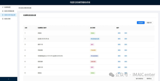 利用机械臂辅助线激光测距主要依赖于机械臂的空间直线运动带来的便利,在测距过程中,机械臂的操作可以划分为主要的四个类别:初始化:初始化机械臂到方便运动的位姿;悬停:机械臂完成操作后,保证安全的停顿;移动到指定地点:机械臂运行到需要测距的位置;移动固定路线:控制机械臂进行直线运动。根据固定的操作,设置好运行顺序后,将操作保存。