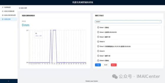 根据保存的操作流程,点击开始按钮便可以执行测距操作,为防止意外发生,还要暂停和终止按钮用来中断机械臂的运行。