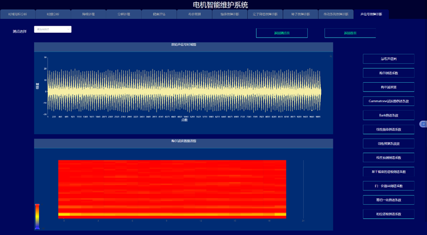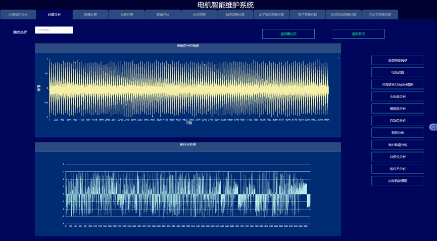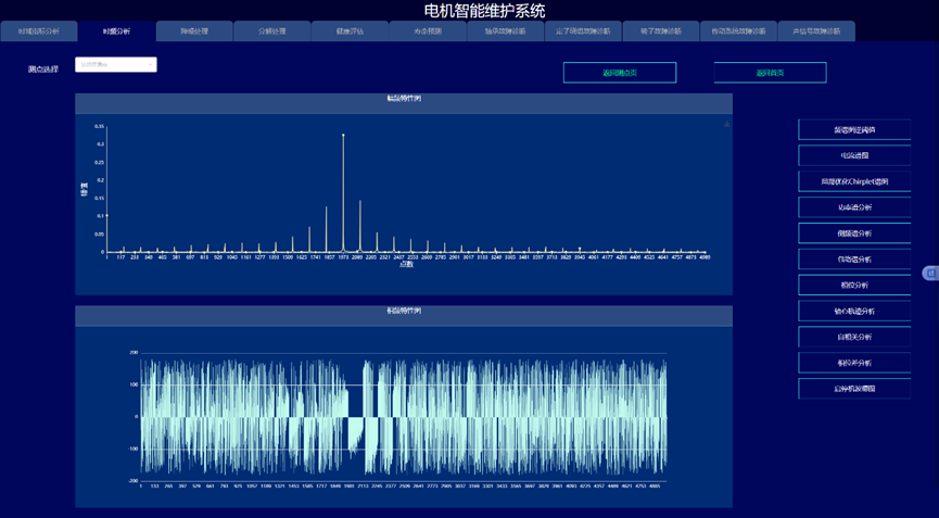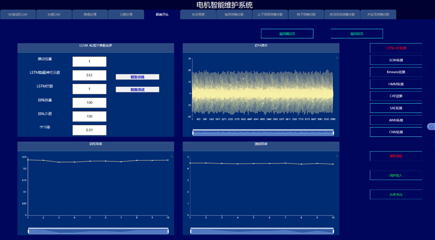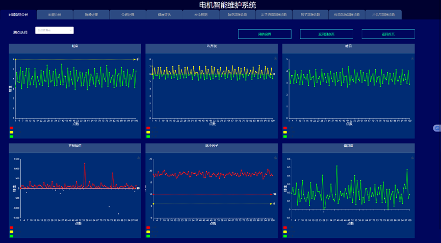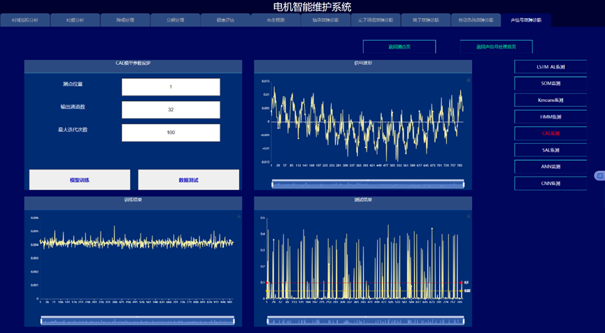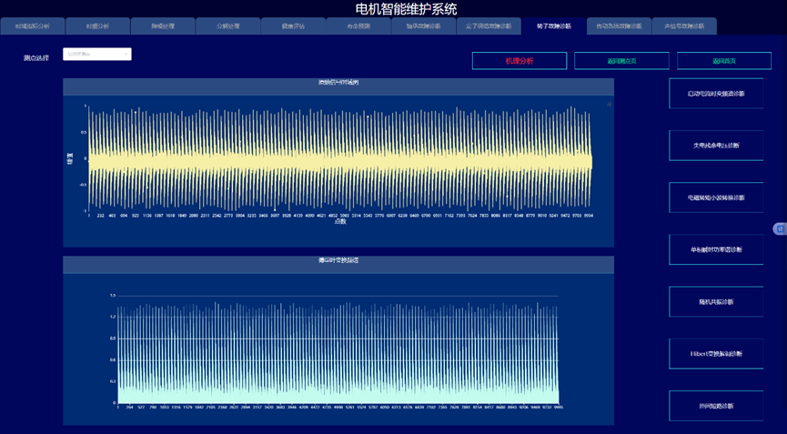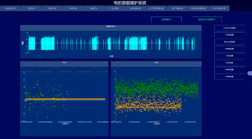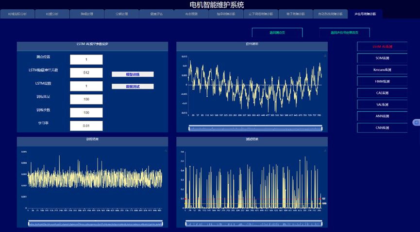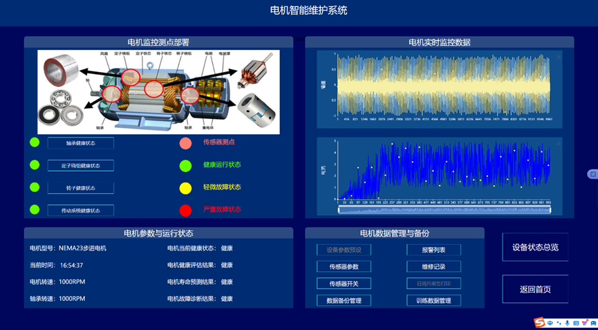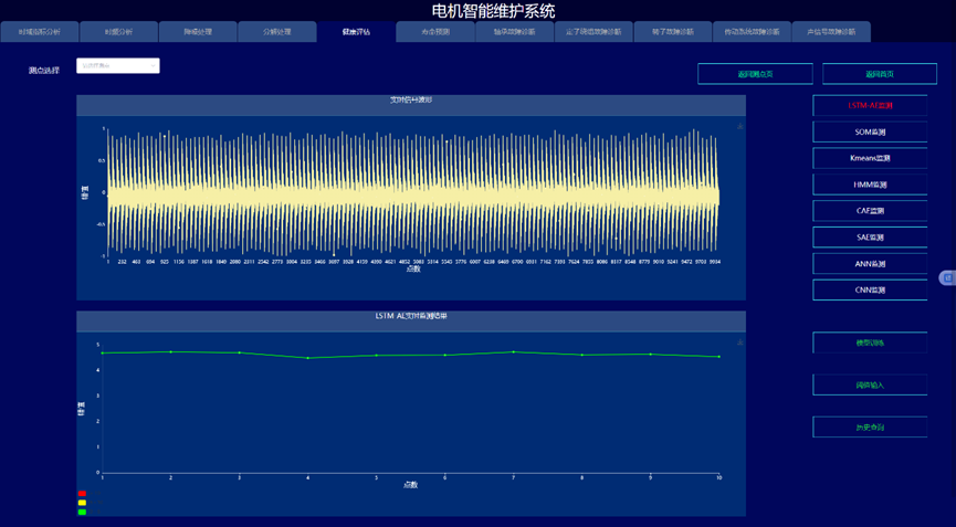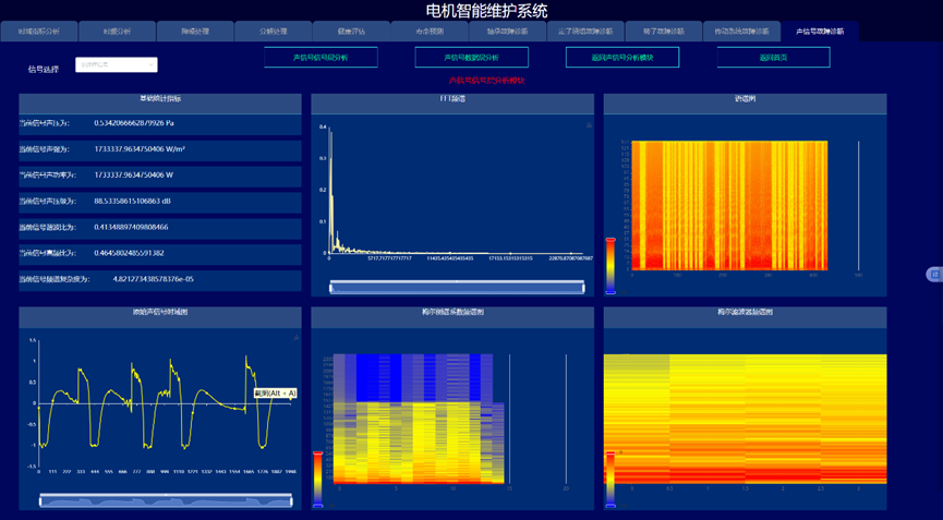 通过构建信号处理与深度学习驱动的电机故障诊断与健康预诊系统,实现变变速与变载荷条件下的电机的故障诊断与健康量化趋势评估与寿命预测,以提高电机可靠度以及有效延长机械使用寿命为目的。系统采集电机的振动、声信号、电流、电压、温度,开展电机的轴承、定子、转子等故障监测与健康预诊。通过各种信号处理算法的深入应用,建立基于信号去噪和缺陷特征提取的故障诊断和预示方法,达到提取强噪声下多传感信号的弱故障特征达到缺陷早期预示的目的。在信号智能感知技术攻关的基础上,利用多传感器技术和大数据技术,建立健康趋势监测与预测系统,对其进行有效监控与故障诊断。