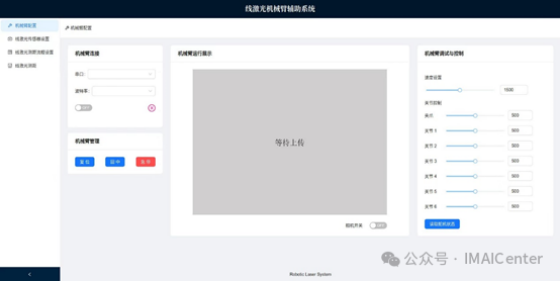 首先,选择机械臂的串口和波特率,连接机械臂;接着打开中间的相机按钮,通过前端观察到机械臂的运行状况,然后便可以通过右侧的滑块来控制机械臂的运行,以此来调试机械臂。