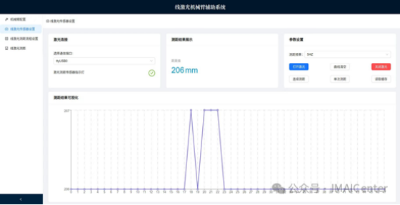 首先,在激光连接区域,选择激光测距仪的端口,连接成功以后,指示灯会变绿;接着,便可以在参数设置区域设置激光测距仪的测距频率,控制激光测距仪进行单次测距或者是连续测距,测距结果会被显示在测距结果显示区域以及以折线图的形式展现在下方的可视化区域。
