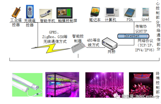 终端控制部分:接收各种通讯网络传输的控制信号,并实时快速作用于LED终端,实现育苗灯、路灯、信号灯等受控终端的准确控制。