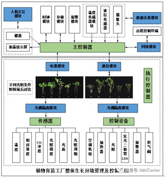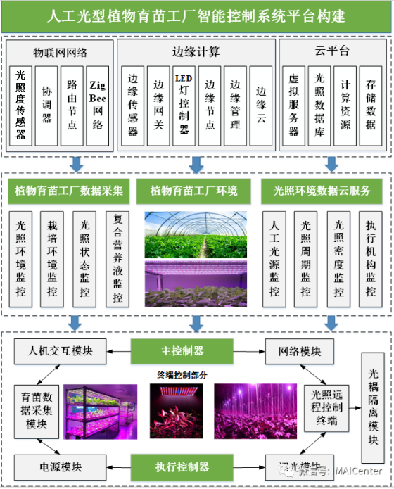 植物育苗工厂的生长环境管理以及智能控制系统是设施智能化农业的高级发展阶段,利用计算机和多传感器或者电路结构等融合构成一个智能控制系统,对工厂环境内的温度,湿度,光强,二氧化碳浓度以及营养液等环境参数进行检测和控制,在高精度环境控制的条件下实现植物的高效高质的生产。人工光型植物工厂设计开发了实时动监控的环境控制系统,可实现环境因子的高精度控制。光照为植物的新陈代谢提供能量,其变化直接影响植物的光合作用和呼吸作用,从而影响着干物质的积累,因此人工光环境在植物工厂中对育苗起到重要作用。环境控制系统设计环境控制系统采用计算机加模块的控制方式。当传感器检测的环境参数高于设定值的上限值时,控制执行机构开启(关闭);当检测的环境参数达到设定值下限时,则控制执行机构关闭(开启)。通过对育苗环境变化情况的有效检测与适时调控,进而保持育苗最佳生长光照环境状态。植物育苗工厂整体环境管理与控制系统设计框图如图所示。