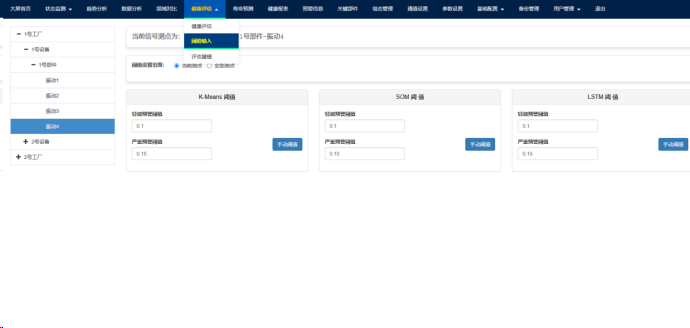 分 K-Means、SOM、LSTM 三种阈值类型,每种类型都有轻微和严重预警阈值的数值显示,还配有 “手动阈值” 按钮,用于手动设置阈值。如Fig.7-2.所示。