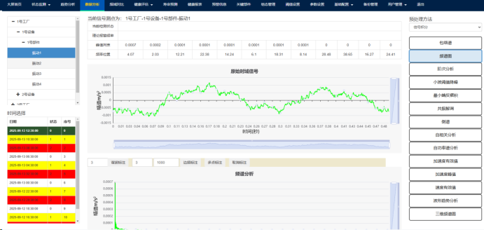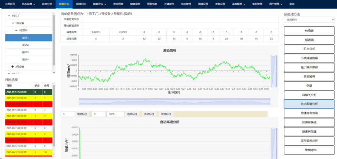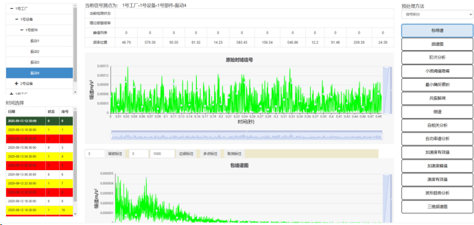 (3)支持设备状态统计功能。设备状态出现预警时,系统有文字和声音提醒,并将预警信息存储。可以实现轴承、齿轮箱故障后系统自动提取故障频率报警;