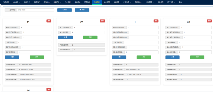 设置主轴承、齿轮箱和发电机的轴承和齿轮副参数,将各个参数存到数据库中。页面最开始会有默认型号,点击搜索,如果数据库中包含该参数,则会自动填充数据,输入转速后点击计算,自动计算相关频率,显示计算结果并将其存储在数据库中。如Fig.11.1所示。