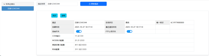 左侧显示所有边缘仪的设备树形导航,右侧顶部为描述信息编辑区(输入框+更新按钮),下方为设备信息卡片。卡片展示设备基本信息(描述、在线状态、唯一标识、创建时间、最近通讯时间)、两个开关控制(连接开关、FTP上传开关)以及四类配置列表(COM端口、MODBUS配置、高速采集卡配置、时控配置)。在线状态根据最近通讯时间判断。