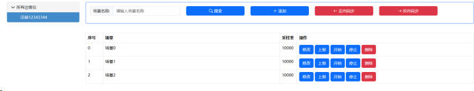 左侧显示所有边缘仪的设备树形导航,右侧顶部为查询条件区(场景名称输入框+搜索+添加+正向同步+反向同步按钮),下方为高速采集卡配置表格(序号、场景、采样率、操作列),支持分页浏览和模态框编辑。表格按itemIndex字段排序显示。