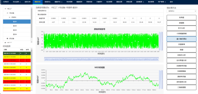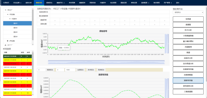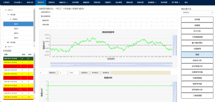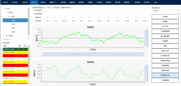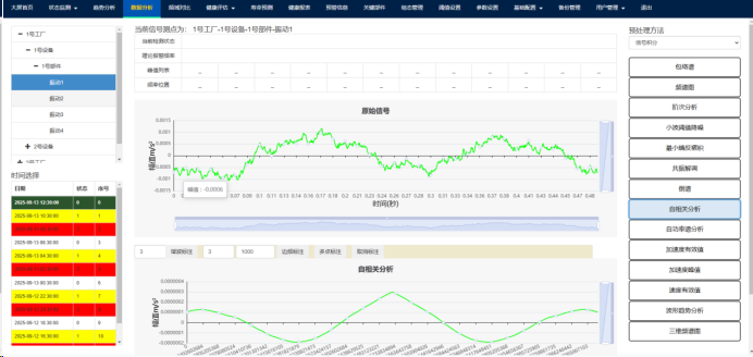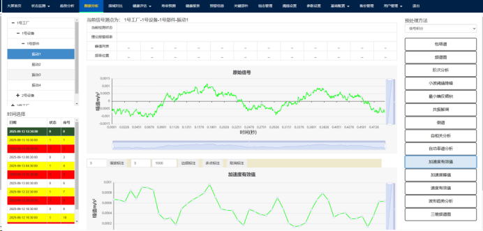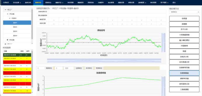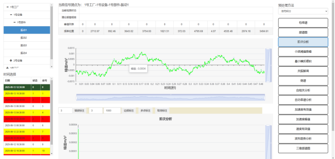 (1)点击上方故障诊断功能按钮,跳转至故障诊断功能界面,包含加速度峰值、加速度有效值、振动趋势分析、速度有效值、频谱图、包络谱、小波阈值降噪、共振解调、最小熵反褶积、自相关分析、自功率谱分析、阶次分析功能,左下角可以选择不同时间的数据。如Fig.5-1.所示。