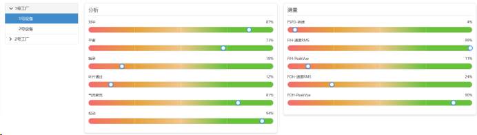 左侧显示设备树形导航,右侧分为两个卡片区域:"分析"卡片展示故障类型分析结果(对中、平衡、轴承、叶片通过、气流紊流、松动),"测量"卡片展示健康度测量数据(转速、速度RMS、PeakVue等)。每个指标使用彩色进度条(红-黄-橙-绿渐变)配合圆形标记显示百分比值。