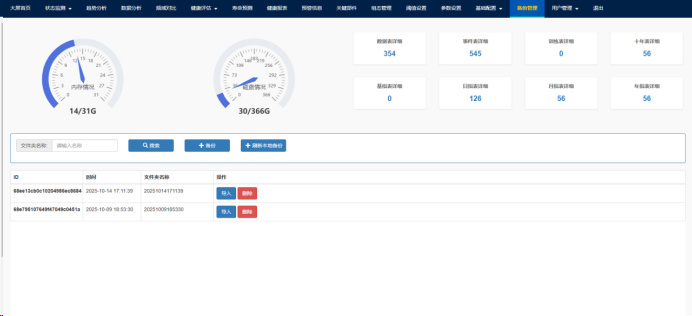 (1)数据导入导出高效。数据导入模块:本系统支持时域和转速数据以csv、xlsx等多种数据格式批量导入。数据导入后,系统可自动识别机组、测点、采样频率等信息,并转换为高效读取分析格式。数据导出模块:系统不仅支持特征值数据以txt、csv、xlsx格式批量导出,还支持导出基本分析或高级分析涉及的各种图谱数据;