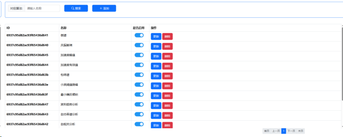 顶部为查询条件区域(算法名称输入框+搜索按钮+添加按钮),下方为数据表格(ID、名称、是否启用、操作列),表格中启用状态使用开关按钮展示。支持分页浏览和模态框弹窗操作。