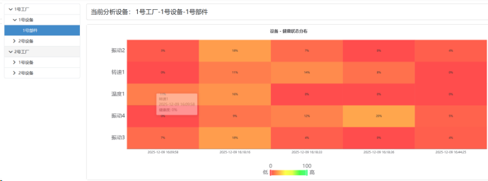 左侧显示设备树形导航,右侧展示热力图可视化区域。热力图以时间为X轴、传感器/部件为Y轴,用颜色表示健康度值(颜色越浅健康度越高)。页面展示部件名称和健康状态历史趋势。