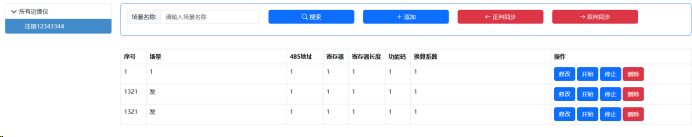 左侧显示所有边缘仪的设备树形导航,右侧顶部为查询条件区(场景名称输入框+搜索+添加+正向同步+反向同步按钮),下方为Modbus配置表格(序号、场景、485地址、寄存器、寄存器长度、功能码、换算系数、操作列),支持分页浏览和模态框编辑。表格按itemIndex字段排序显示。