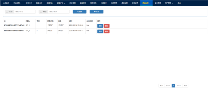 可输入工厂名称、编号,通过 “搜索”“新增” 操作数据,下方表格展示工厂编号、名称、信息及建立日期,每条数据支持 “更新”“删除” 操作。如Fig. 16-1.所示。