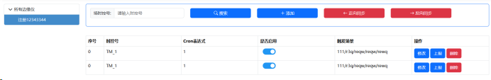 左侧显示所有边缘仪的设备树形导航,右侧顶部为查询条件区(时控号输入框+搜索+添加+正向同步+反向同步按钮),下方为定时任务配置表格(序号、时控号、Cron表达式、启用标识、触发场景、操作列),支持分页浏览和模态框编辑。启用标识使用开关按钮展示,表格按itemIndex字段排序显示。