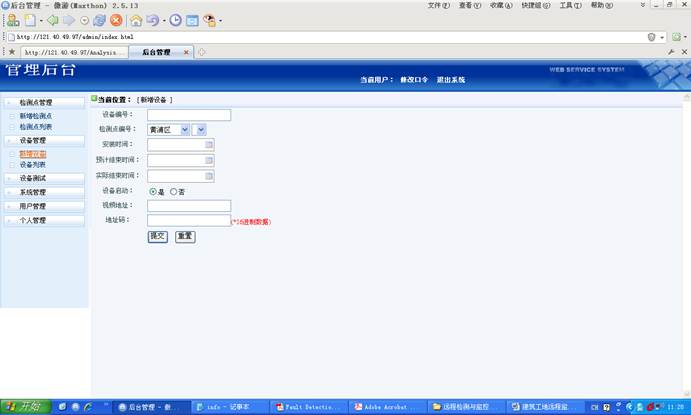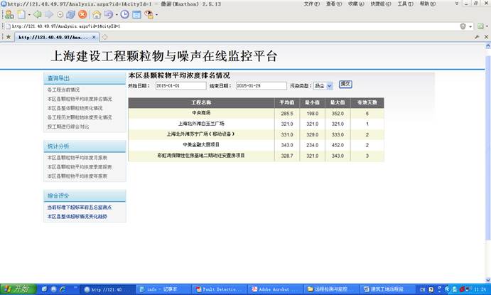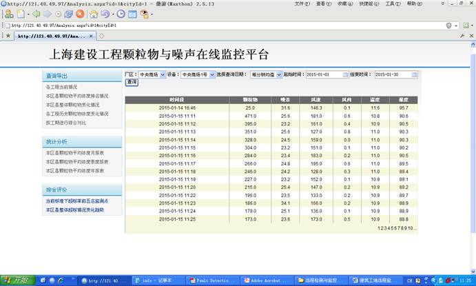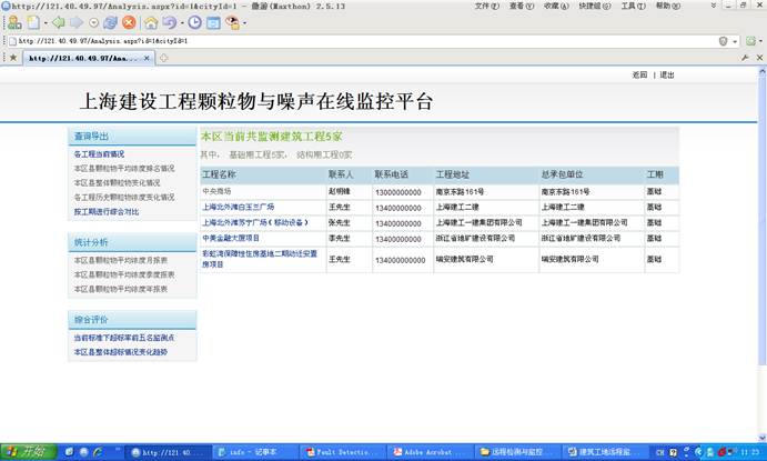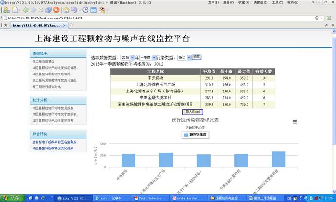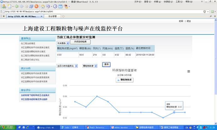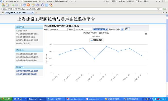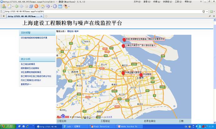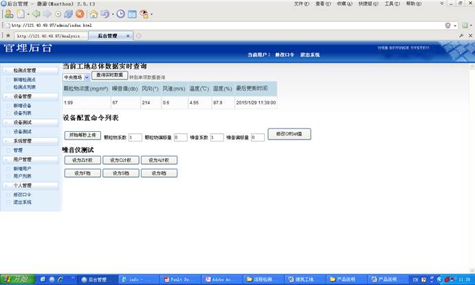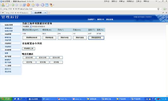 该系统对建筑工地的扬尘与噪音(也可以是其他各种检测场所)进行远程监测与监控,通过现场安装检测仪器,通过远程通讯系统连接到服务器,用户可以通过Web远程进行集中监测与拍照取证等功能。