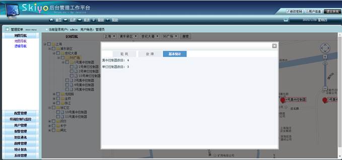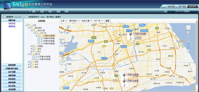 b.区域导航:区域位置导航,区域基本信息,区域内中心控制器和终端状态统计并在地图上的动态显示(可包括开、关、调光状态、健康状态、电量消耗状态)