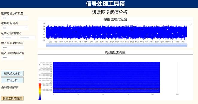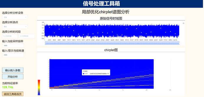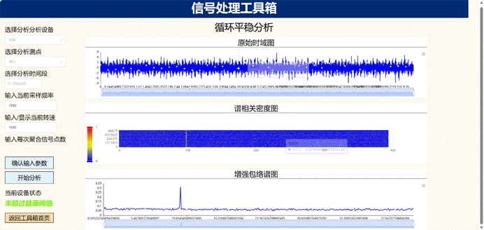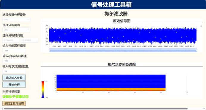 (2)可视化监测与故障诊断模块:实时波形频谱图、设备振动实时趋势、设备运行状态、振动历史比较图、单多值棒图、三维瀑布图、伯德图、提纯轴心轨迹图、二、三维全息谱图、绘制阶次谱图、启停机转速谱图、频域谱细化图、变速信号处理、稀疏保持、信号变换、形态滤波、转子动静平衡测试等算法模型;