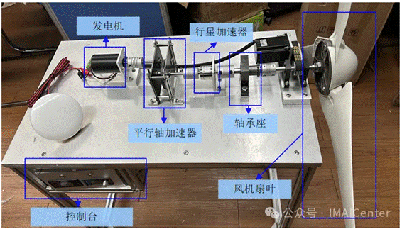 <1>测试台组成测试台由6个部分组成,分别为控制台、发电机、平行轴加速器、行星加速器、轴承座、风机扇叶。