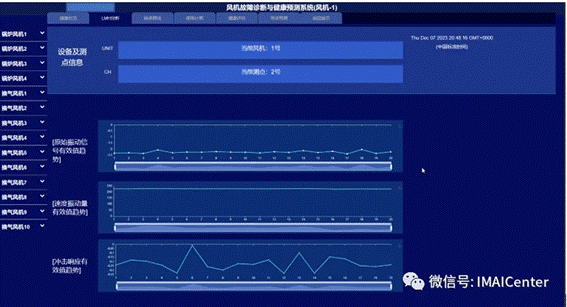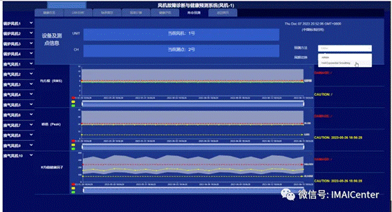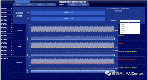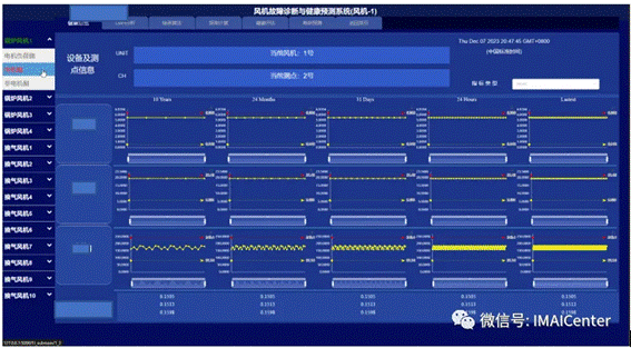 该模块上半部分显示当前的风机号及测点号,下半部分针对该测点通过各种人工智能方法对风机不同时间周期进行健康与寿命预测。