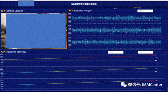 该模块显示各个风机多个测点的健康信息,蓝绿色为健康运行、黄色为轻微故障、红色为严重故障,同时显示多个测点传感数据的时域/频域信号及健康指标信息。点击测点示意图上的多个测点图标即可进入各个测点的详细分析界面。